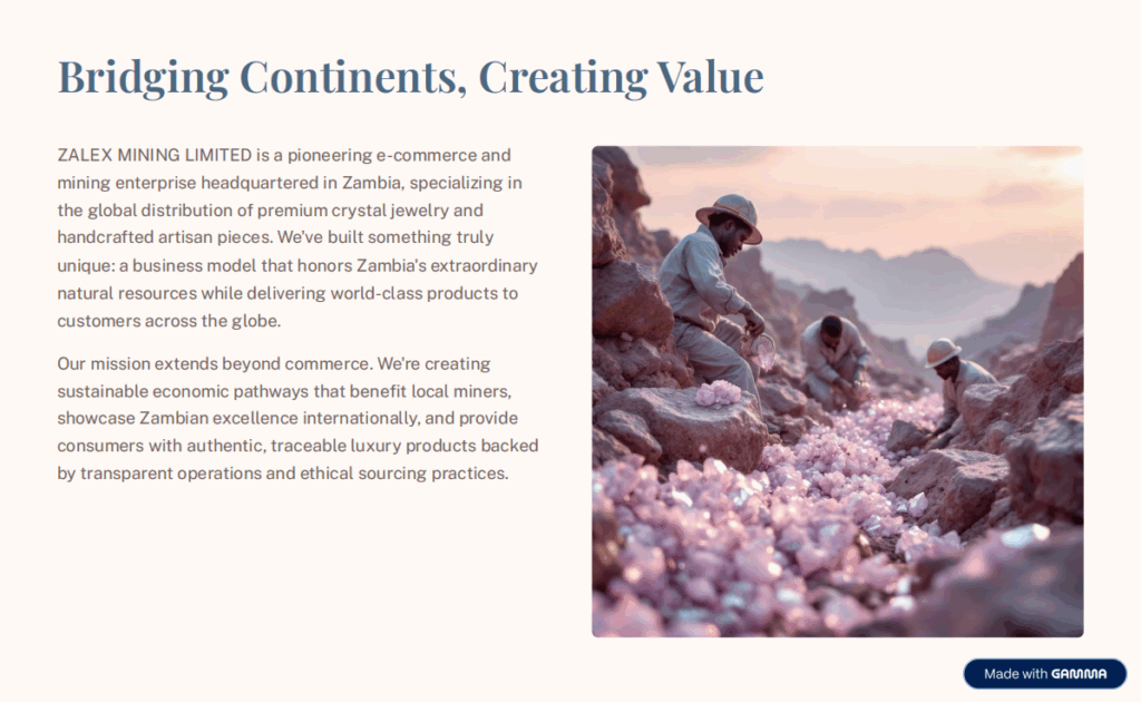 ZALEX MINING LIMITED is an innovative, diversified e-commerce and mining company headquartered in Zambia, specializing in the global retailing of high-quality crystal jewelry and handicrafts. Our core mission is to leverage Zambia’s unparalleled natural resources—the world’s finest raw crystal—and bring them directly to consumers worldwide through a seamlessly integrated digital and supply chain platform.