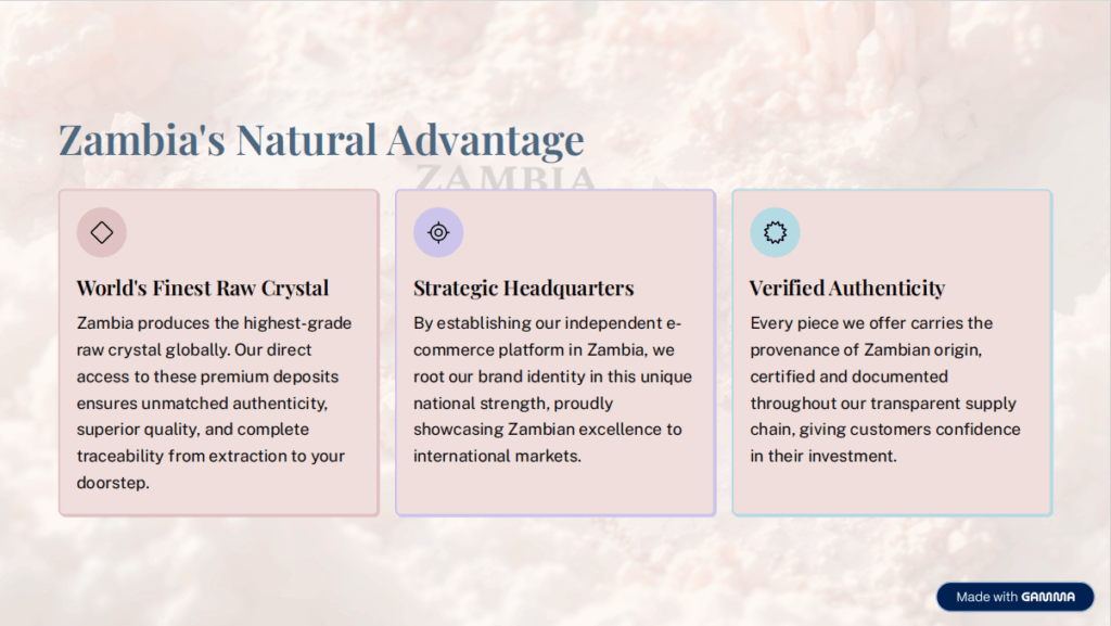 - Zambia is renowned for producing the world’s highest-grade raw crystal. Our location provides direct access to premium raw materials, ensuring authenticity, superior quality, and traceability from mine to market. By establishing our independent e-commerce site in Zambia, we proudly root our brand identity in this unique national strength.