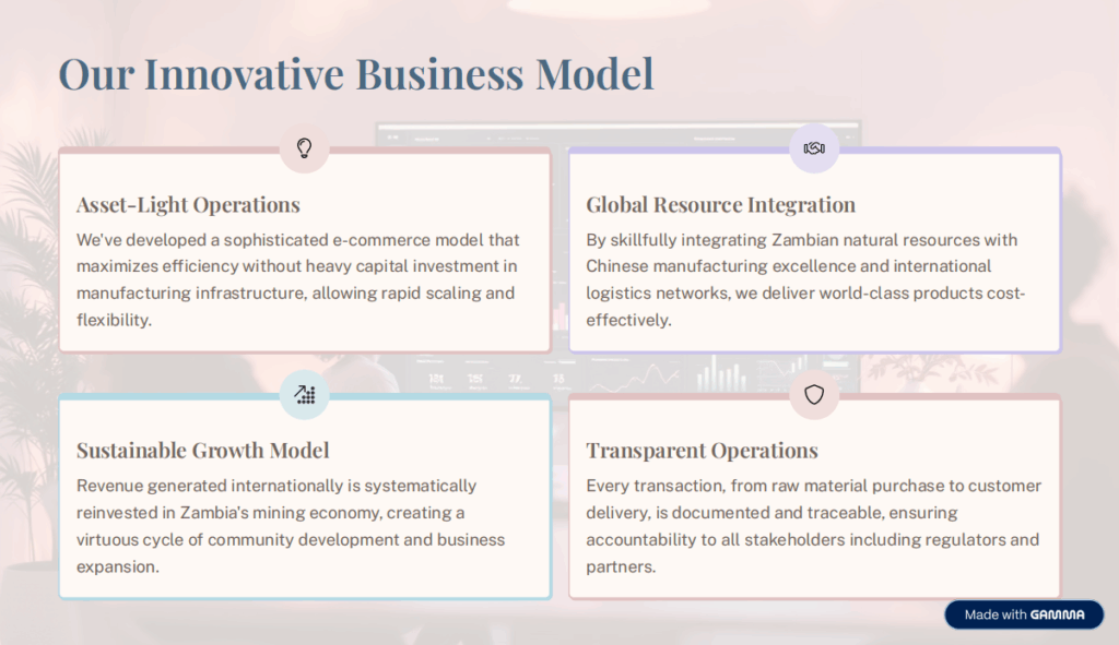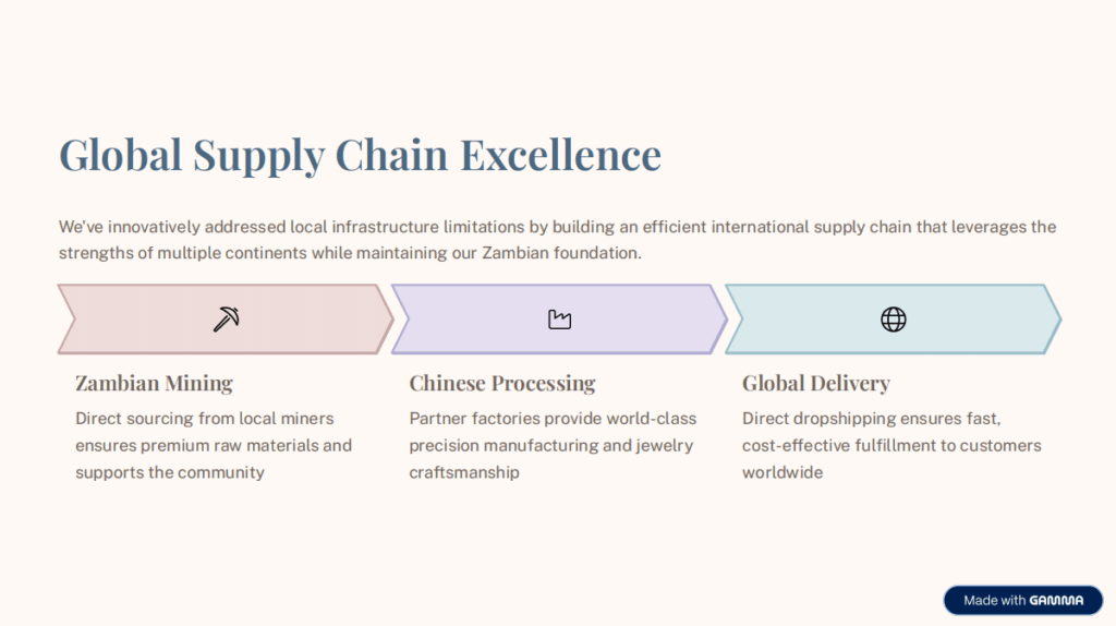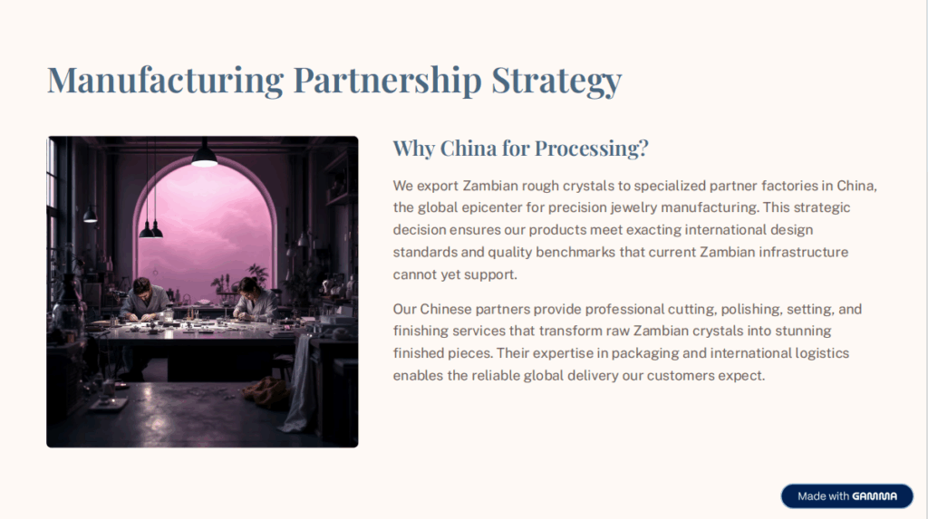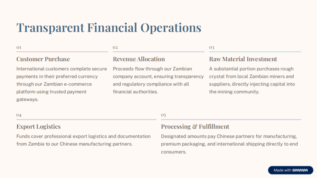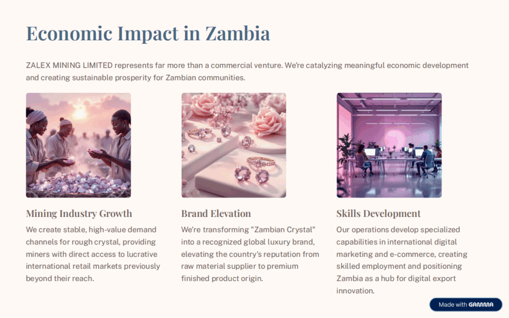 4-4. Skills and Market Development: We are developing specialized capabilities in international marketing and e-commerce within Zambia, creating skilled jobs and positioning the country as a hub for digital export operations in the gemstone industry.