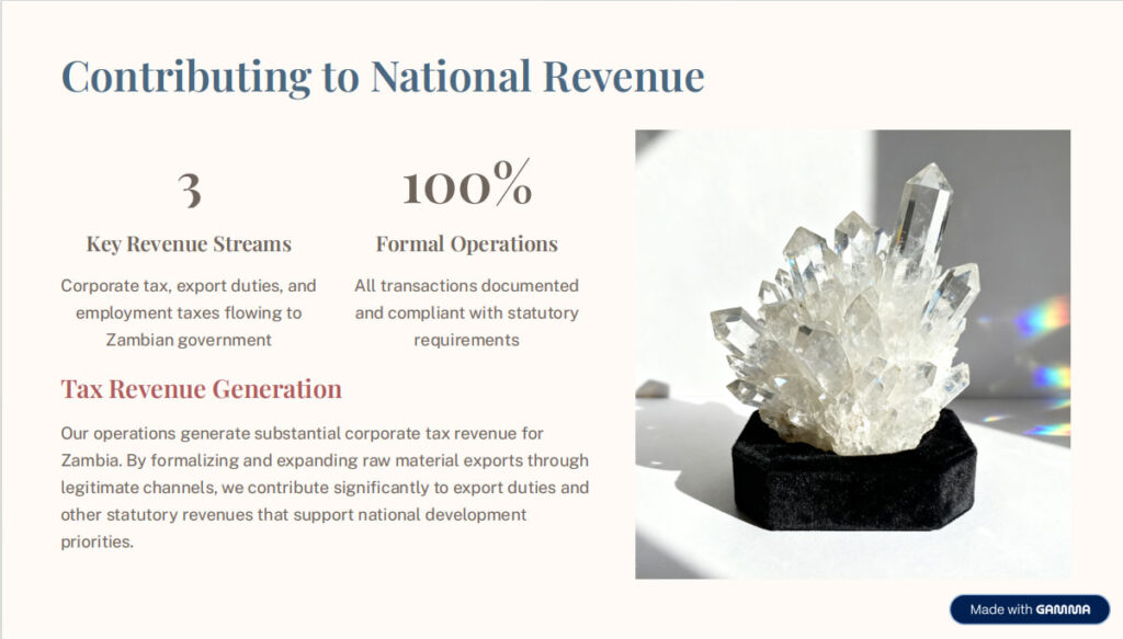 4-2. Enhancing the Reputation of the Gemstone Industry: We will promote “Zambian Crystal” globally as a high-end brand, elevating its export from raw materials to high-value finished products. 4-3. Tax Revenue Generation: Our operations generate corporate tax revenue for Zambia. Furthermore, by formalizing and expanding raw material exports, we contribute to export duties and other statutory revenues.