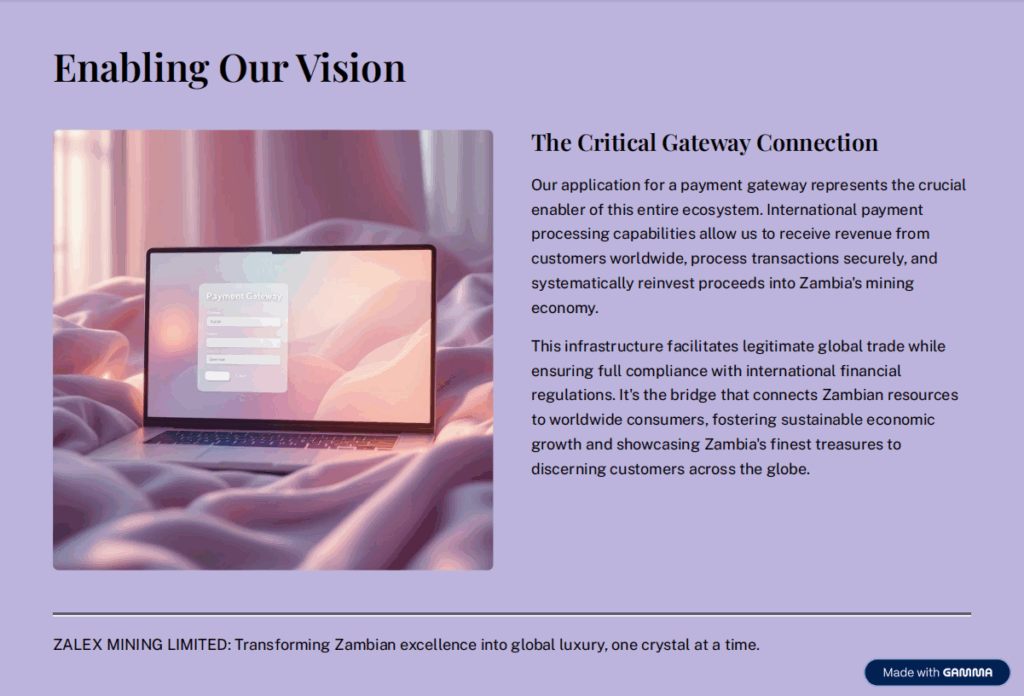 In summary, ZALEX MINING LIMITED has developed a sophisticated, asset-light e-commerce model that leverages Zambia’s natural wealth while skillfully integrating global resources for manufacturing and fulfillment. Our application for a payment gateway is crucial to facilitating this global trade, enabling us to receive international revenue and reinvest it in Zambia’s mining economy, thereby fostering sustainable growth and showcasing the best of Zambia to the world.